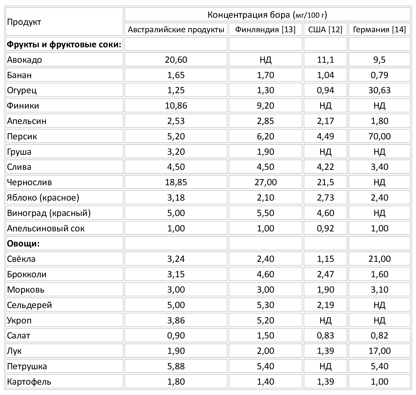 Важно! В этой работе показано содержание бора в одних и тех же продуктах в Австралии, Финляндии, США и Германии. И сразу бросается в глаза, насколько сильно эти показатели отличаются. Причина проста: разный уровень бора в почвах и сортовые особенности растений.